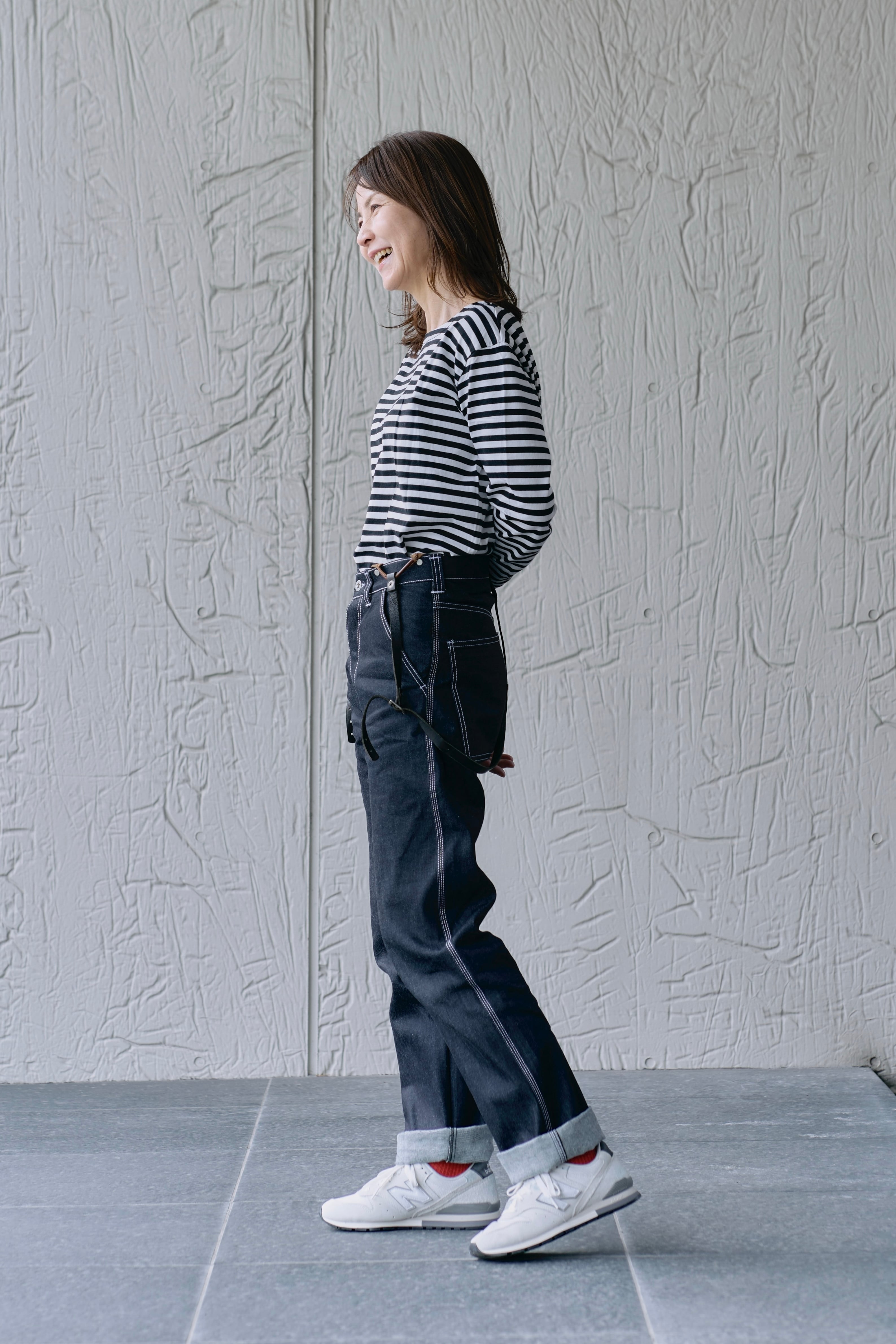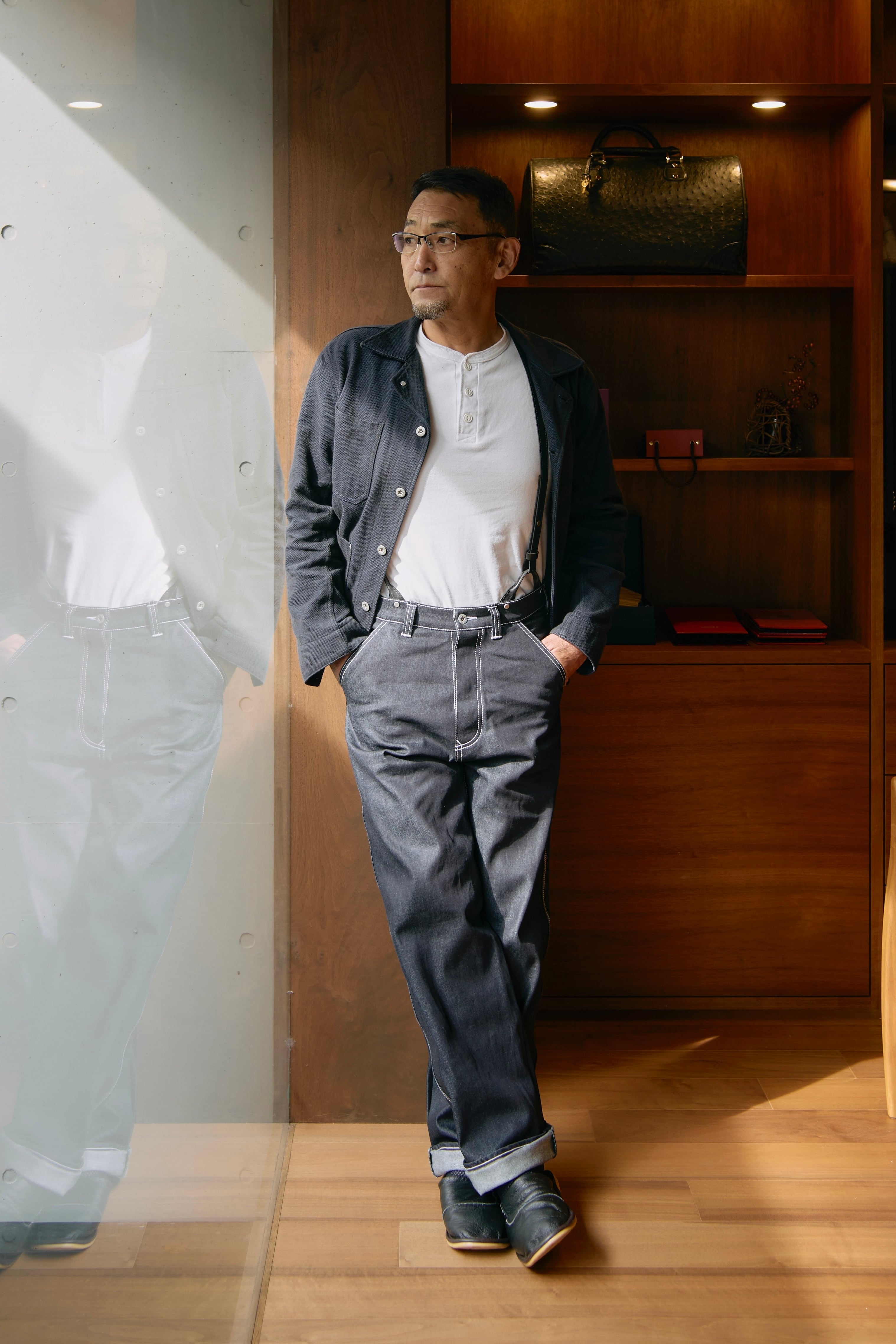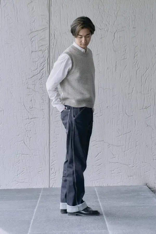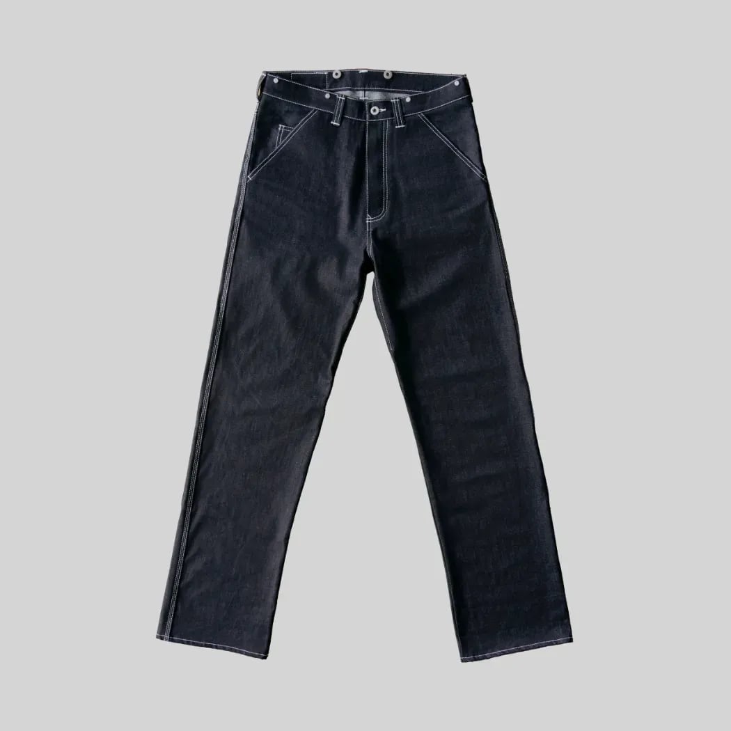 当時の史料に残されていた、現代のジーンズの原型でもある「ウエストオーバーオール」に着想を得て、サスペンダーボタンなどを採用しつつ、普段使いをしやすいように、ベルトループもつけてヴィンテージの雰囲気をまとう、こだわりのストレートデニムを製作いたしました。ベルトを使った普通の履き方はもちろん、吊りベルトを用いたウエストオーバーオールらしい履き方も楽しめる1本となっています。