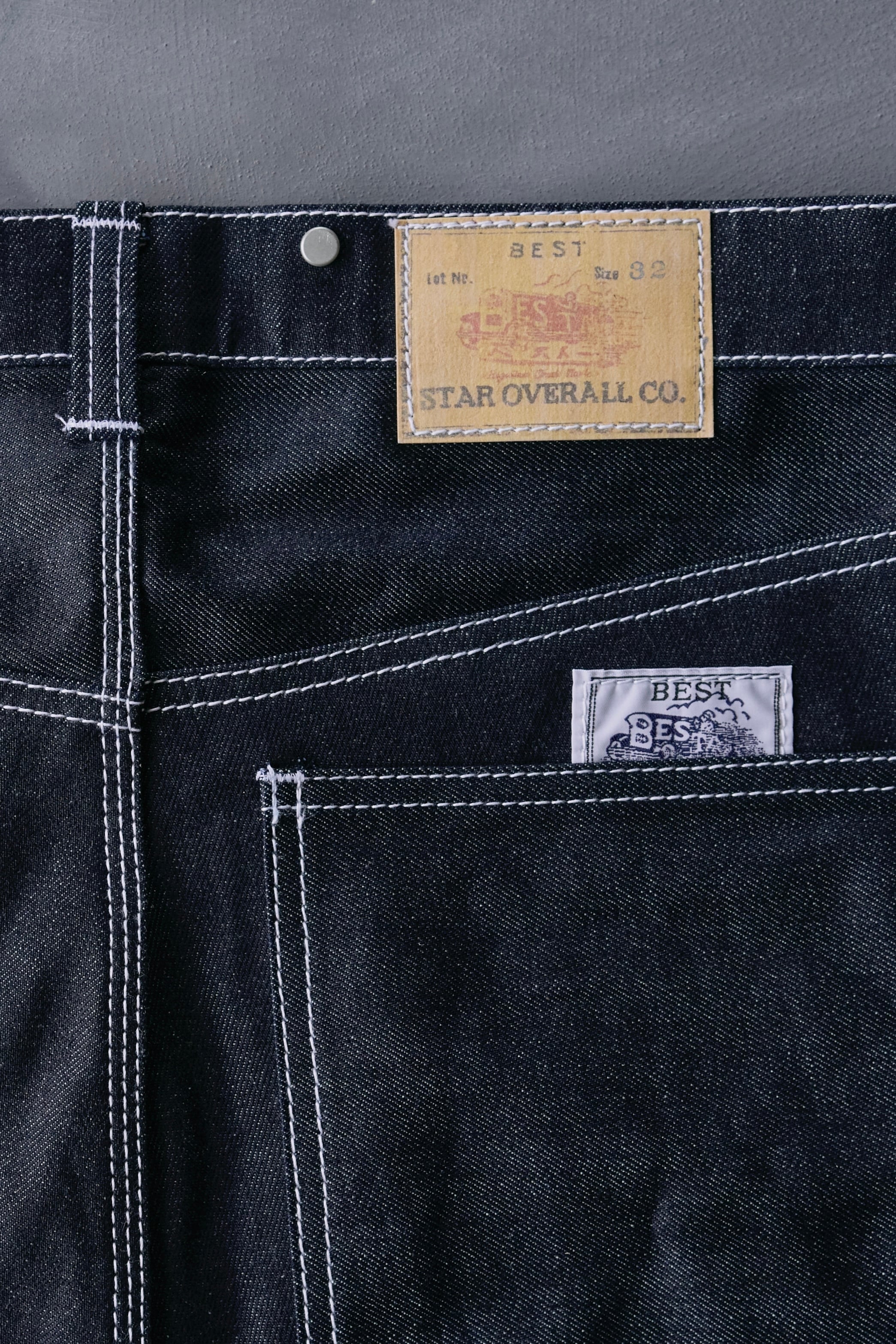 なぜ、このデニムパンツを「ウエストオーバーオール」と名付けたのか。その答えは、ウエスト部分に隠された”インナーボタン”にあります。当時の資料から着想を得たこのモデルは、サスペンダーで吊るして穿くという、デニムパンツの原点ともいえるスタイルを再現しています。そのためのサスペンダーボタンをウエストの内側に搭載し、本格的なクラシックスタイルを可能にしました。また、ベルトループも備えているため、普段使いのデニムパンツとしても機能します。STAR OVERALLらしさと、現代的な実用性を両立させた、現代版のウエストオーバーオール<ストレートデニム>となります。